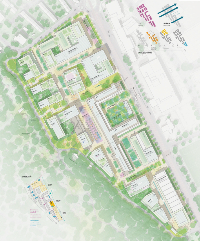 - Wettbewerbssieger ist der Entwurf des Städtebau- und Landschaftsarchitekturbüros NUWELA, welcher den historischen Bestand in ein modernes Stadtquartier integriert.