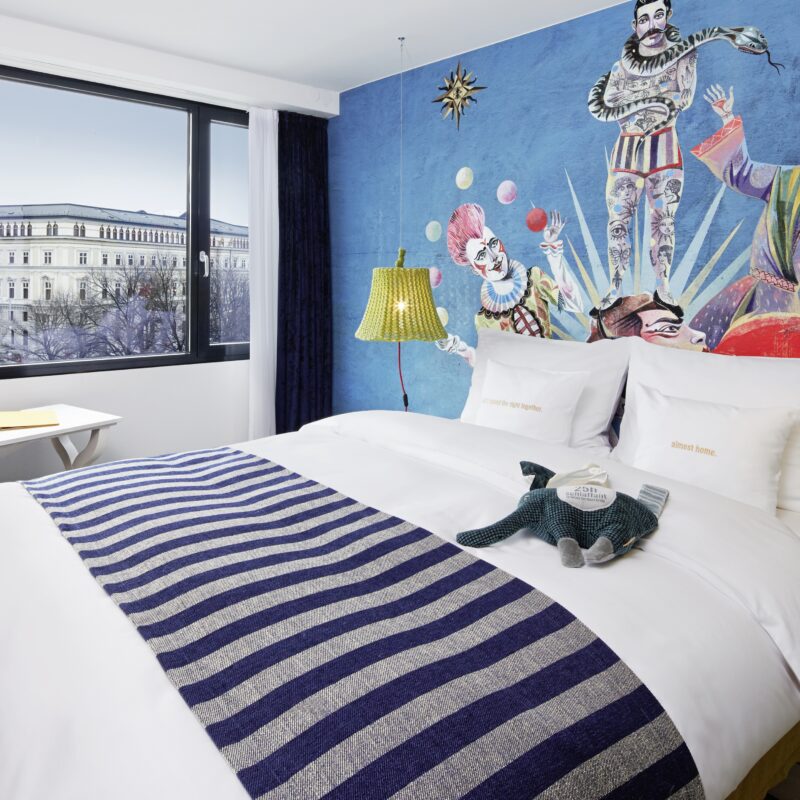 The hotel features the Italian restaurant Ribelli, the popular rooftop bar Der Dachboden, and the food truck Kvetch, which serves smashed burgers. The circus-style interior design and the roof terrace create an extraordinary experience and make the hotel a meeting place for connoisseurs and creative types.